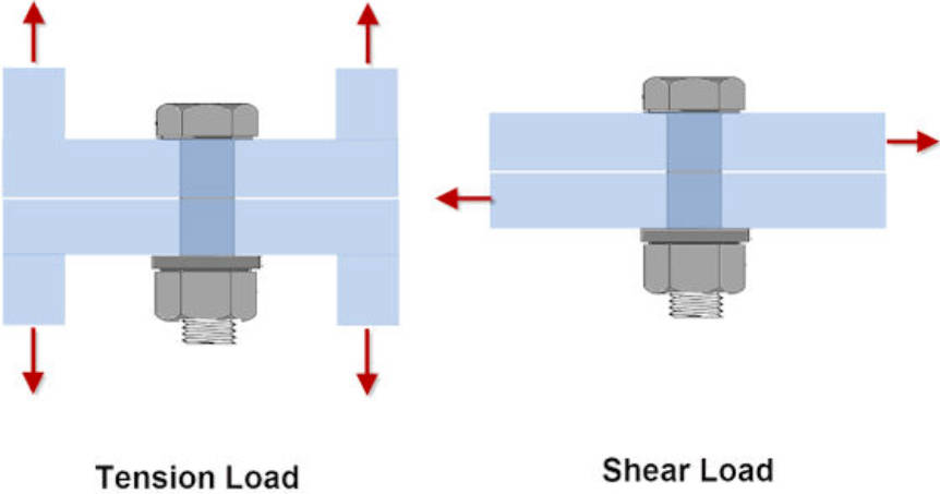 The requirements that a component must meet are in part a direct result of the component’s function. Fasteners, the most common thread-rolled pieces, are used in a lot of different ways and some fasteners have different requirements than others as a result. Some are tightened into place and held in constant tension, and require tensile strength, while others require sheer strength and have to undergo strength from the opposite direction as shown below: